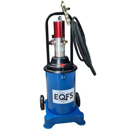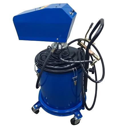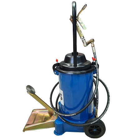Нагнетатель смазки пневматический мобильный для шприцевания консистентной смазкой (солидолонагнетатель) производительностью 800 г/мин. Объем бака – 16,2 кг. При давлении воздуха 6-8 Атм давление смазки 350-400 Атм максимально. В комплекте раздаточный пистолет с жестким наконечником, адаптер для подключения 1/4”, шланг 5 м. Габариты: 320X360X890 мм, масса 12,8 кг.