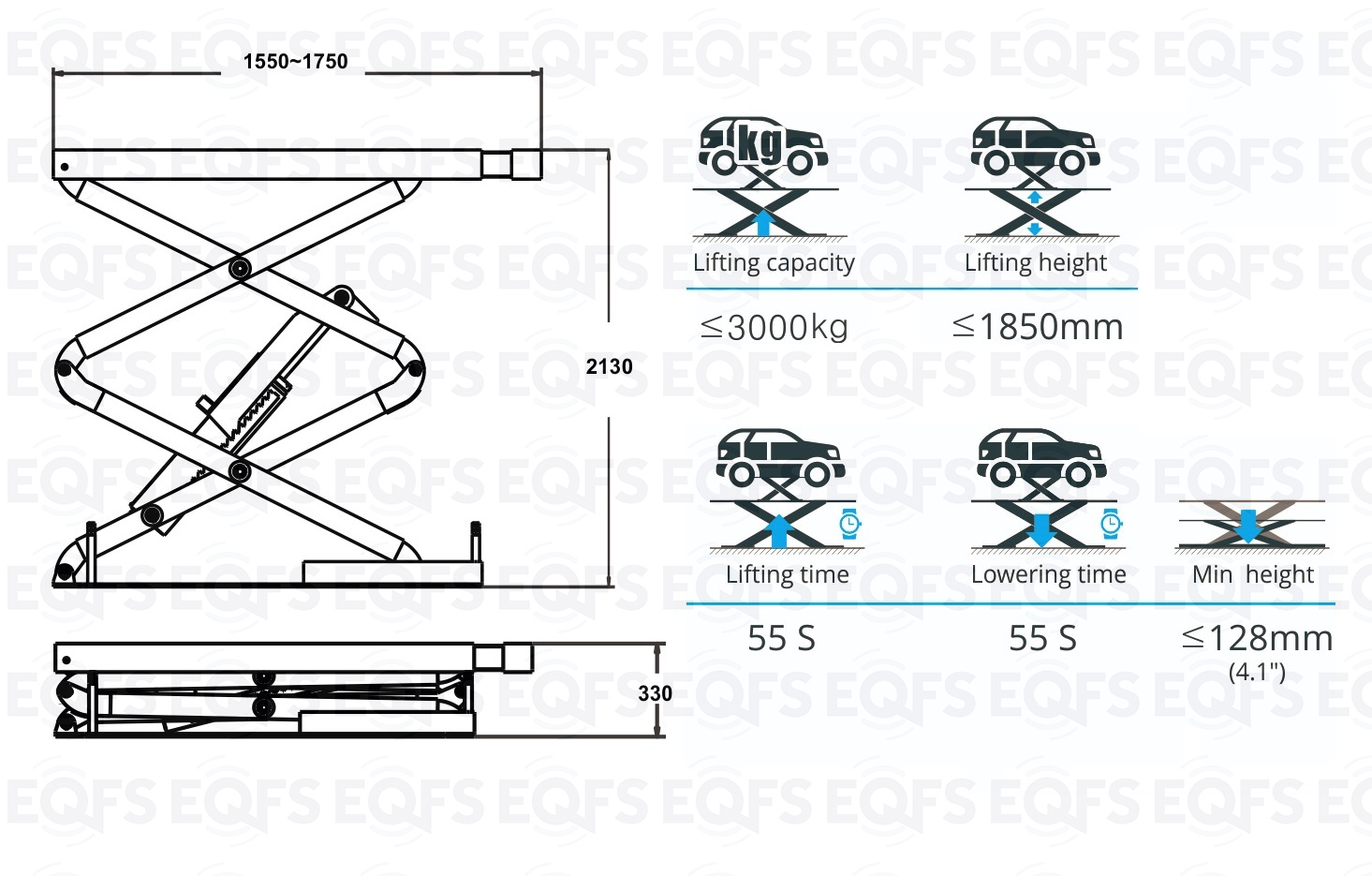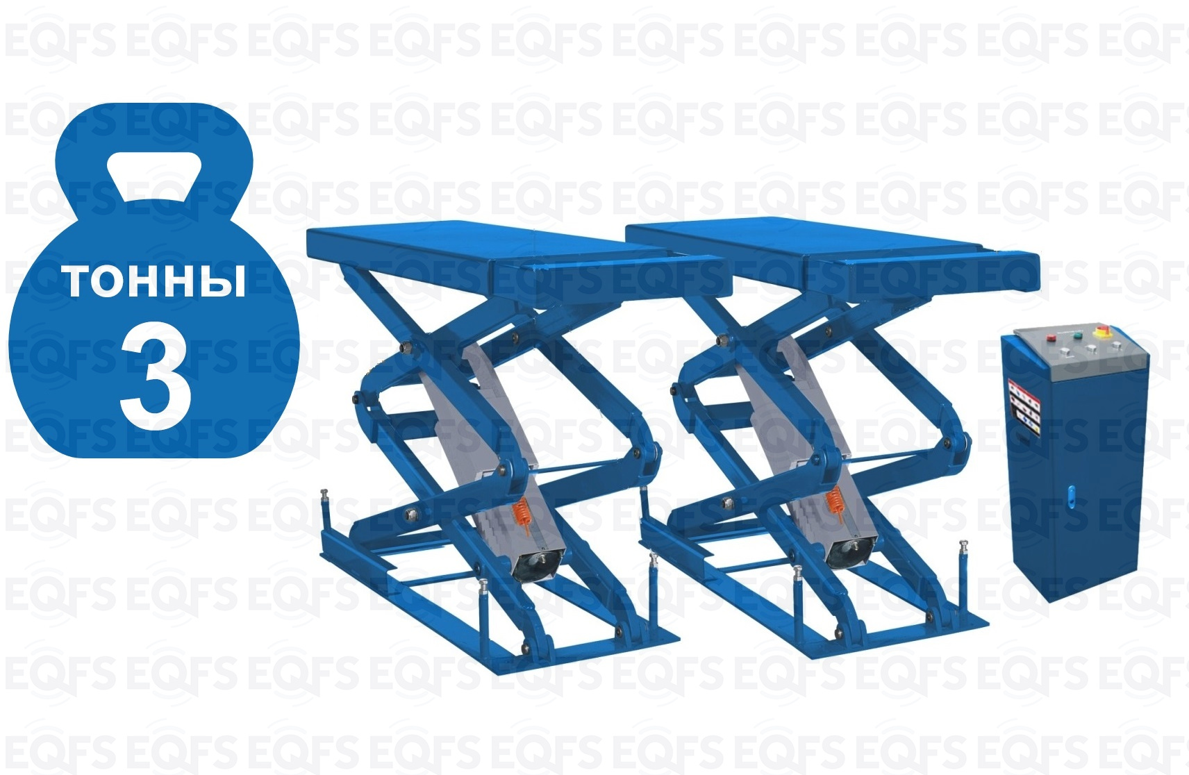 Подъемник автомобильный гидравлический ножничный заглубляемый «ровный пол», грузоподъемность 3 тонны. Для слесарных, кузовных, шиномонтажных работ и зоны приёмки. Ножничный подъемник оборудован пневматическим стопорным механизмом – требуется подключение к пневмолинии. Раздвижные трапы подъемника позволяют увеличить длину платформ с 1550 до 1750мм. Высота подъема 2130мм, от уровня пола 1800мм., заглубление 330мм. Расстояние между платформами 780мм. Длина трапов в сложенном состоянии 1580мм. Стойка управления подъемником расположена отдельно.
