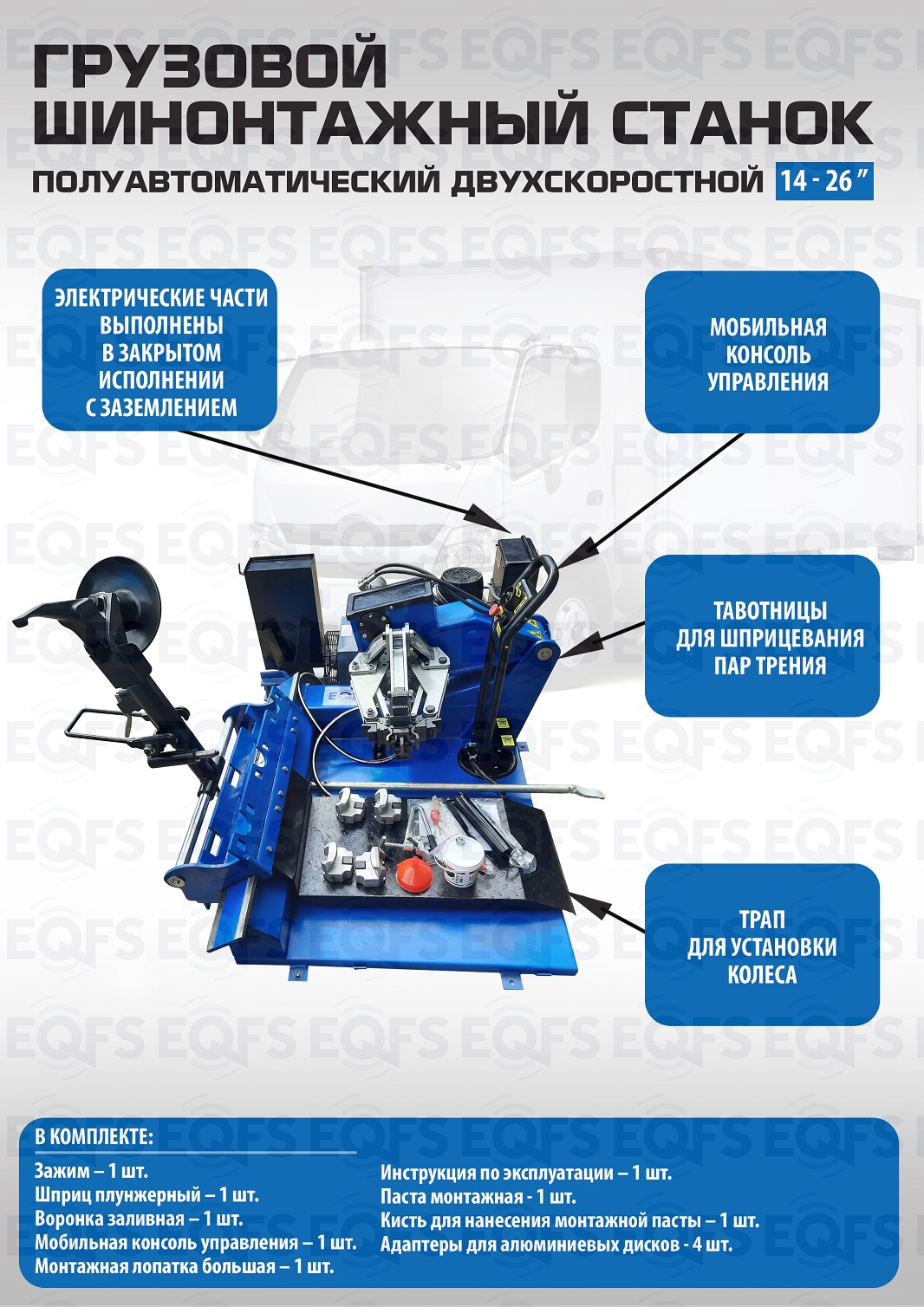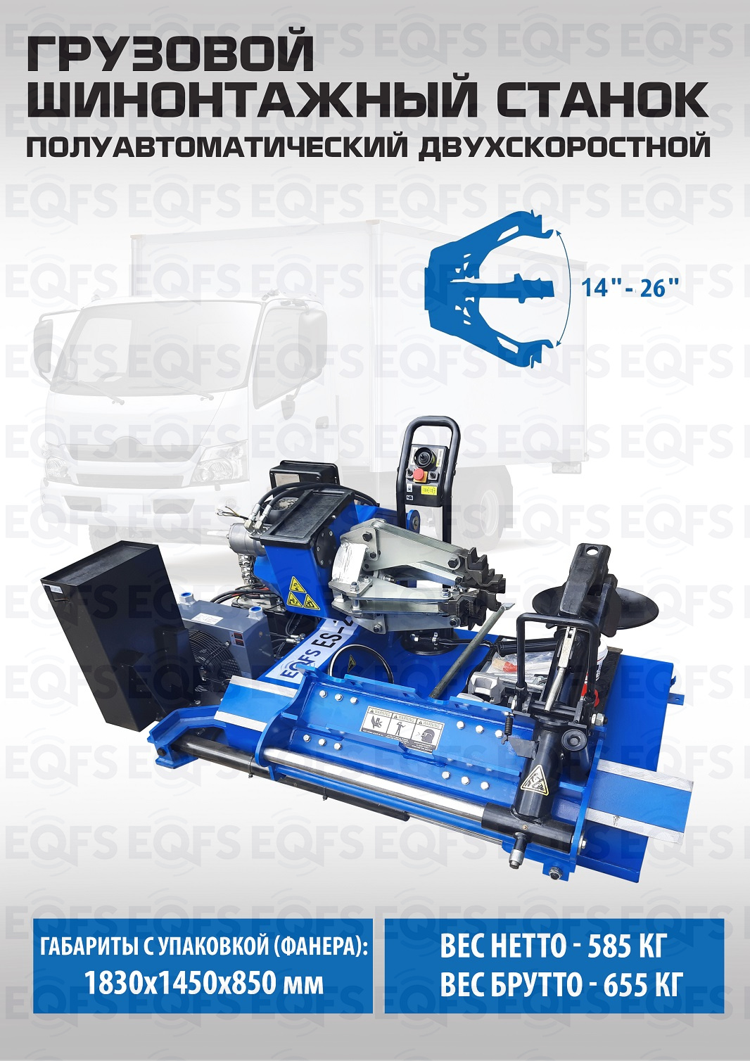 ES-26 грузовой шиномонтажный станок Нет редуктора- нет трущихся деталей. Защита от перегрузок и неправильной эксплуатации. Усиленная стальная рама. Мобильная консоль управления. 2-х скоростной, 14÷26”. Мощность привода 3,0 кВт. Гарантия 18мес. Диски сталь, AL, с кольцами и без. Колесо макс. Ø1600 ширина 780мм, до 500кг.