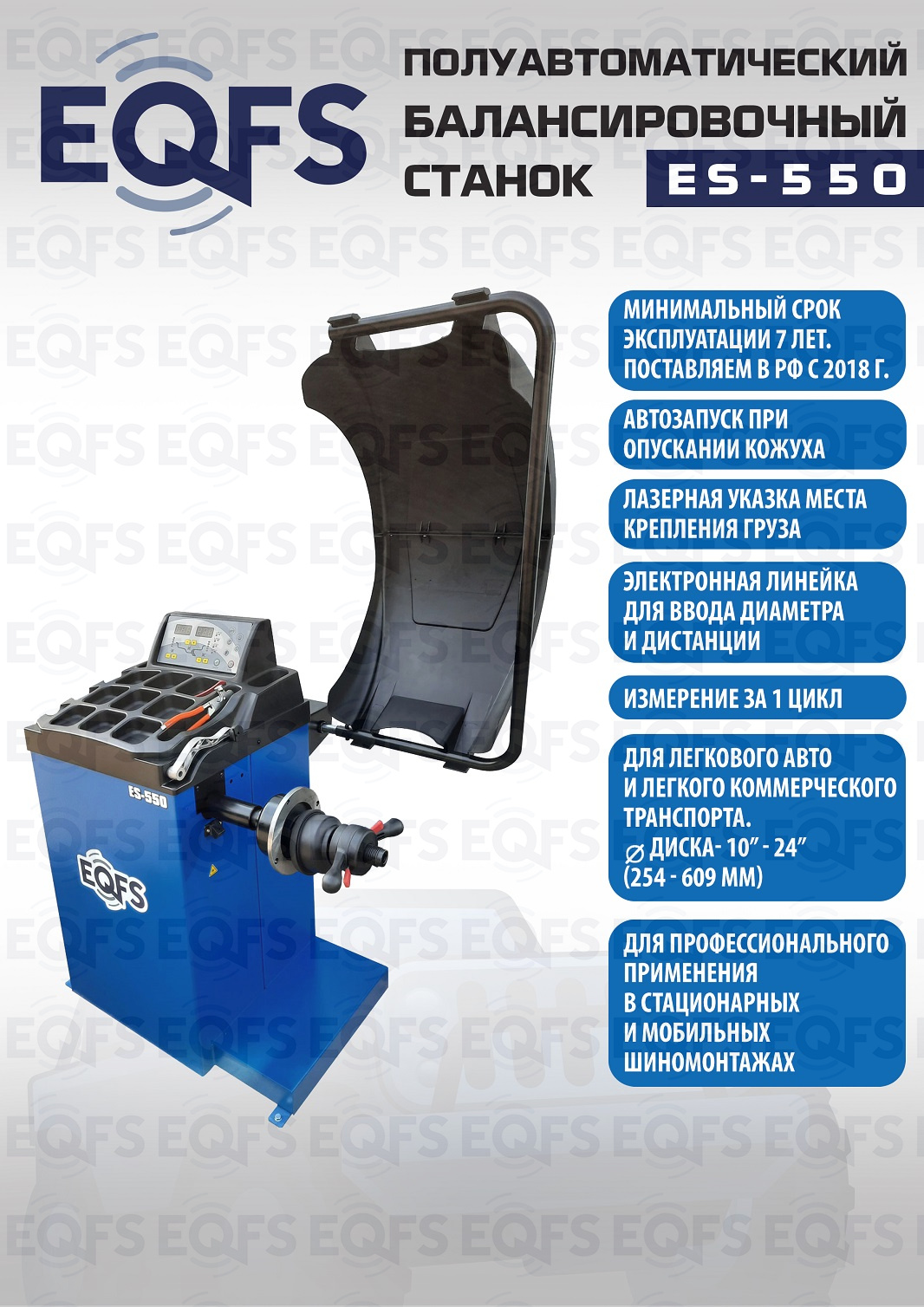 + ES-550 Балансировочный станок. Полуавтомат. Удобный и понятный интерфейс. Автозапуск опусканием кожуха. Автоматический ввод дистанции и диаметра диска. Лазерная навигация. Автокалибровка. Для колес легковых автомобилей, мотоциклов, «Газелей», «Спринтеров» с диаметром диска с резиной до 800 мм. Размеры диска: ширина 3–10” (76-254 мм) , диаметр диска 10–24” (254÷609 мм). Вес ≤ 65 кг. Вал- 36 мм. Точность ±1гр. 220 В. Режимы работы DINAMIC, STATIC, ALU1, ALU2, ALU3, ALUS, ST. Гарантия 12 мес.