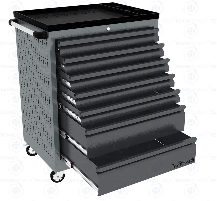 Тележки инструментальные серии PROFFI 950 предназначены для использования на предприятиях любого профиля занятых ремонтом и изготовлением различной продукции. На боковые стенки инструментальной тележки нанесена перфорация размером 25х25 мм и диаметром отверстия 8 мм, что позволяет устанавливать на них навесной инструмент или крючки. Наибольшей популярностью тележки инструментальные пользуются в сфере авторемонта и обслуживания автомобилей .Тележки имеют выдвижные ящики на шариковых телескопических направляющих полного выдвижения с фиксацией в закрытом положении, предотвращающее открывание при передвижении тележки. Ящики имеют центральный замок, который позволяет ограничить доступ посторонних лиц к содержимому ящиков. Тележка инструментальная изготовлена из высококачественного металла ведущих Российских производителей, покрашена порошковой краской производства Германии, имеет итальянскую и турецкую фурнитуру. Тележки для инструмента оснащены двумя не поворотными колесами диаметром 100 мм, одним поворотным и одним поворотным со стопором, которое фиксирует тележку и предотвращает непроизвольное скатывание.