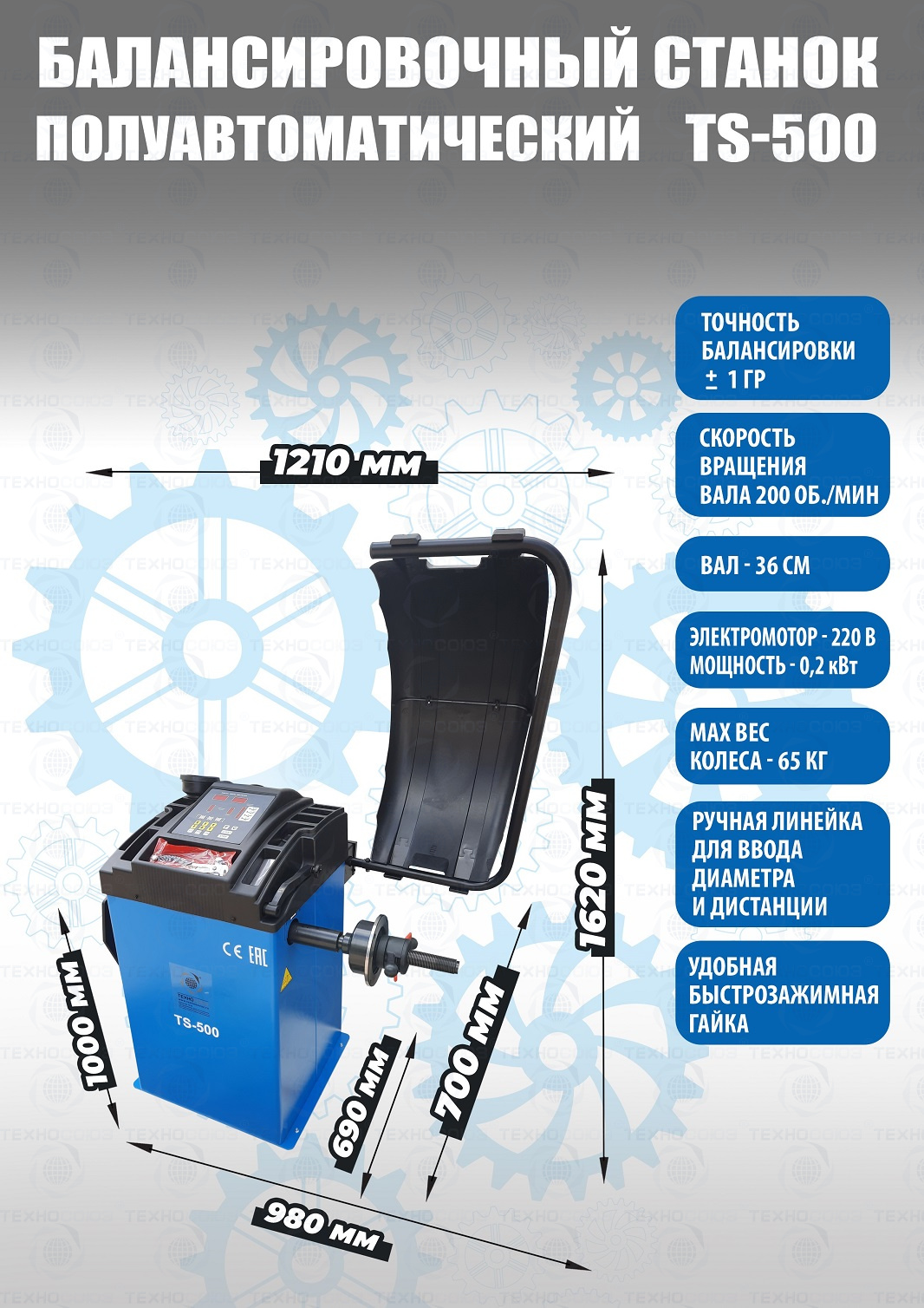 + TS-500 Полуавтоматический балансировочный станок для колес легковых автомобилей, мотоциклов и легких грузовиков. В комплекте: кожух с автозапуском + клещи + кронциркуль + быстрозажимная гайка + набор конусов. Для балансировки колес с диаметром диска с резиной до 760 мм. Размеры диска: ширина 3–9” (76-228 мм) , диаметр диска" - 10–21” (254-533 мм). Вал-36 мм. Максимальный вес колеса с диском – 65 кг. Точность ±1гр. Напряжение 220В. Данные станки возим более 10 лет. Надежные - в сезон не подведут! Напряжение шиномонтажных станков 220В или 380В на выбор.