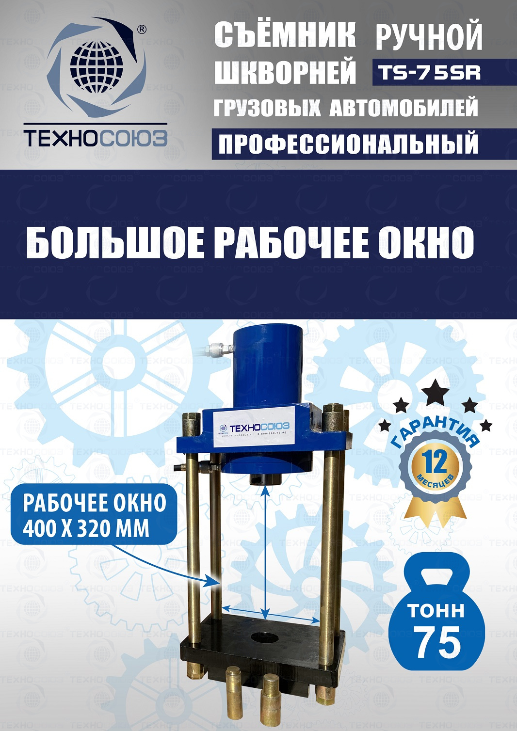 Сокращает время ремонта. Можно использовать при выездных работах. Позволяет работать под разными углами. Для выпрессовки шкворней из поворотной цапфы погрузчиков, тракторов, строительной техники, коммерческих и грузовых авто отечественного и импортного производства: MAN, MERCEDES, SCANIA, VOLVO, Корейские и Китайские авто. Можно использовать при выездных работах. Ручной гидравлический привод. Рабочее окно 400x320 мм. Усилие 75 тонн.