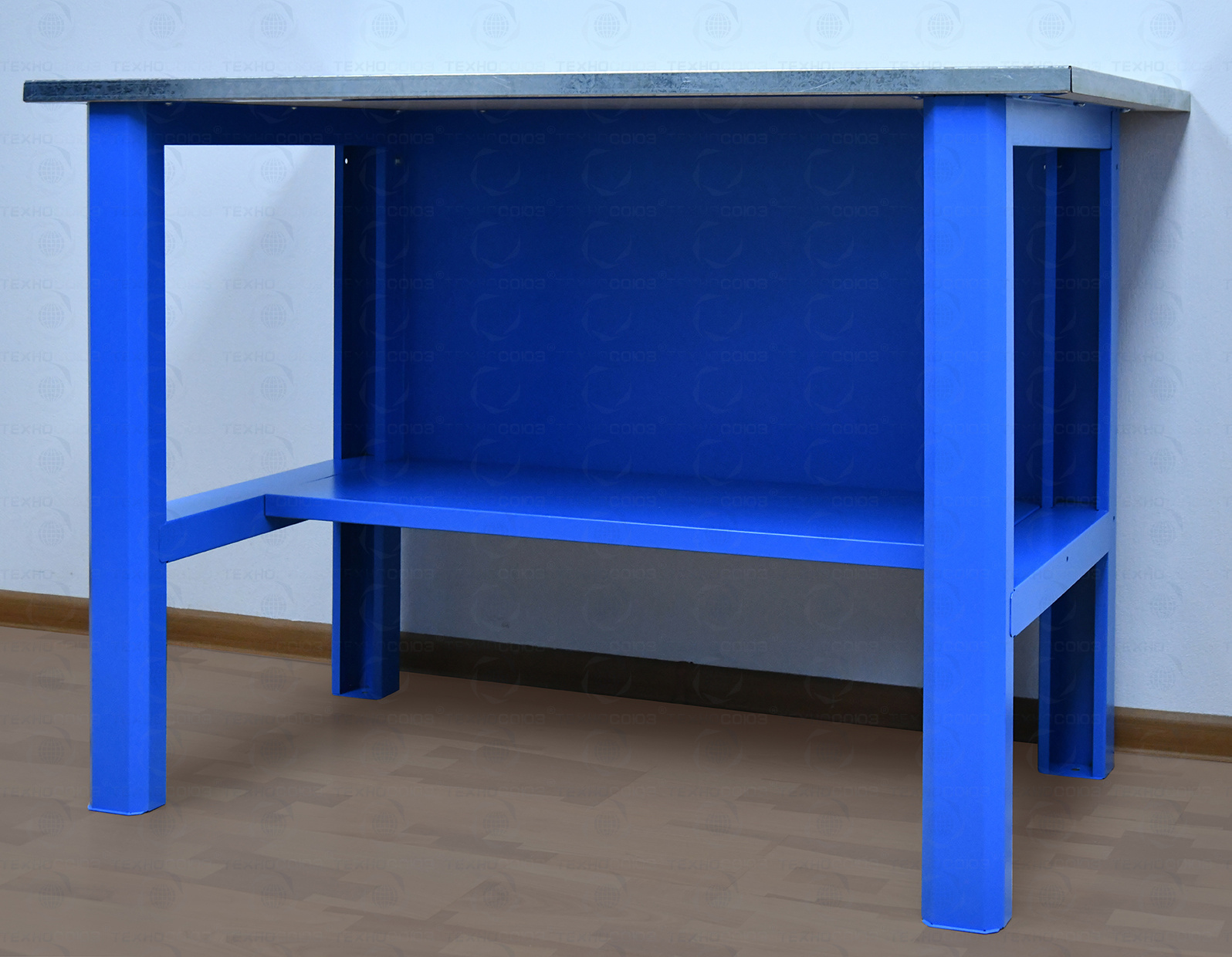 Верстак комплектуется полкой-стенкой, расположенной под столешницей для удобного размещения габаритного инструмента и оснастки. Опорные элементы выполнены сварными из холоднокатаной стали. Все металлические элементы покрыты полиэфирной порошковой краской. Столешница из фанеры толщиной 24 мм, которая покрыта листом оцинкованной стали толщиной 1,2 мм. Глубина столешниц 696 мм. Максимальная масса груза на столешнице - 350 кг.