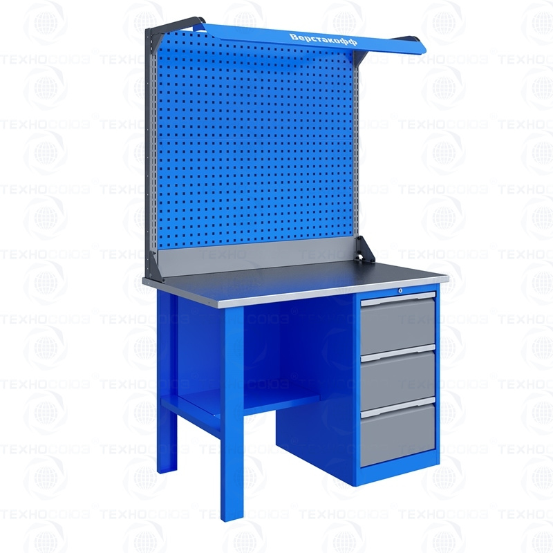Однотумбовый. Допустимая нагрузка на столешницу 750 кг. Опорные элементы выполнены сварными из холоднокатаной стали. Для выполнения сборочных, ремонтных, слесарных, монтажных и других видов работ на производстве, в сервисных центрах, мастерских, гаражах, а также для обучения технологии в учебных заведениях. Комплектуется полкой-стенкой, расположенной под столешницей для удобного размещения габаритного инструмента и оснастки. Размеры верстака: 855x1196x696 мм. Вес: 71 кг. Поставляется в 4 комплектациях на выбор.